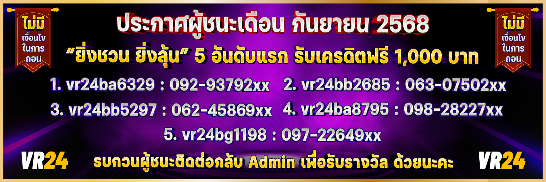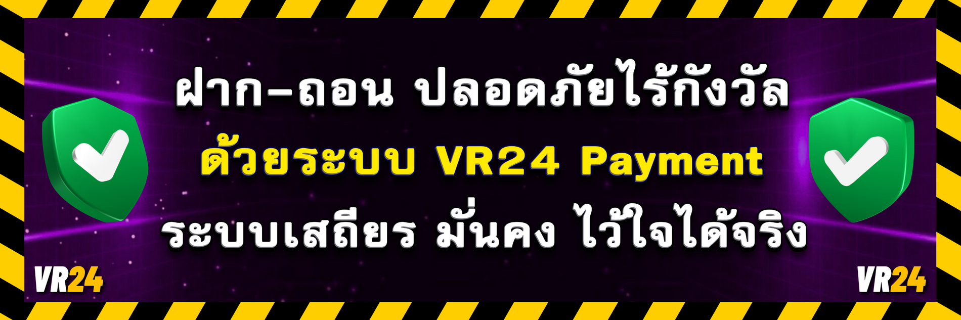 ด้วยระบบอัตโนมัติที่ทันสมัย ปลอดภัย และมีความเสถียรสูง ทำให้การสมัครและทำธุรกรรมกับ VR24 เป็นเรื่องง่าย ไม่ยุ่งยาก ไม่ต้องรอนาน คุณจึงสามารถเพลิดเพลินกับการเดิมพันได้อย่างต่อเนื่อง ไม่มีสะดุด แถมยังมีโปรโมชั่นดีๆ อีกมากมายที่รอให้คุณมาร่วมสนุกกัน มาเป็นส่วนหนึ่งของครอบครัว VR24 กันนะครับ